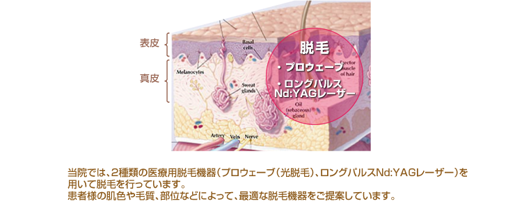 「医療用プロウェーブ脱毛装置」は、従来の単波長レーザーと異なり、脱毛に効果がある波長帯をスキンタイプや毛質に合わせて選択できる特殊なフラッシュランプ治療機器です。