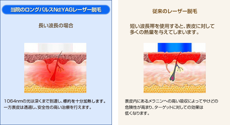 ロングパルスNd:YAGレーザーによるレーザー脱毛は、毛のメラニン色素に選択的に吸収される波長 (1064nm)を使用しています。肌に優しい脱毛治療が可能な医療用脱毛治療機器です。様々な肌色や毛質に幅広く対応できるので、安心で確実な治療が可能です。