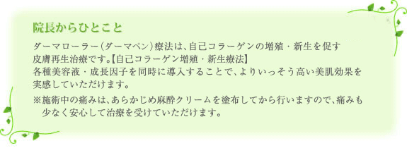 |院長からひとこと|ダーマローラー(ダーマペン)とは|成長因子とは|治療の流れ|