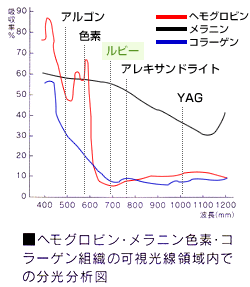 ルビーレーザーの波長694nmは、シミやアザの原因である メラニン色素に対して吸収が高く、コラーゲン組織や ヘモグロビンにはほとんど吸収されません。 そのため正常組織のダメージを最小限に抑えながらメラニンを有する細胞のみ選択的に破壊します。数あるQスイッチレーザーの中でも当院のQスイッチルビーレーザーは極力、熱緩和時間を短く抑え(照射時間20ns(ナノ秒)、 この短い時間に適切なエネルギーを照射することでレーザー光は真皮部分まで到達し正常組織へのダメージを抑えながら有効な治療を行うことができます。