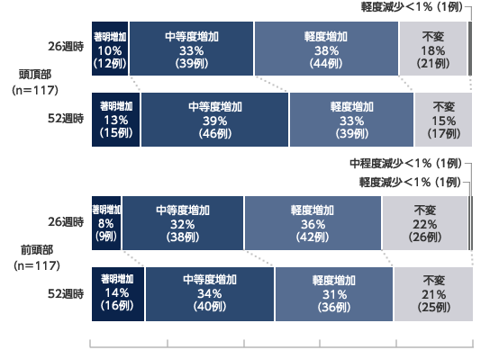 ※プロペシア錠(1mg)を1日1回1錠内服することで、投与1年後に既に毛髪状態の改善・維持(改善58%、維持40%)認め、3年間の継続治療にて、毛髪状態改善例の締める割合が増加(改善78%、維持20%)しています。