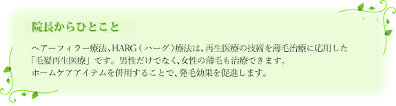 HARG(ハーグ)療法とは、Hair(毛髪) Re-generative(再生)theraphy(治療)という言葉の頭文字で、