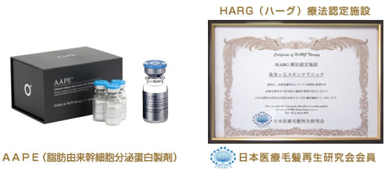 (※HARG療法で使用されるAAPE® (脂肪由来幹細胞分泌蛋白製剤)は、脂肪幹細胞から、細菌、ウイルスフリーにて製造されており、非常に安全性が高いものです。アレルギー起因物質を含まないことが確認されており、
