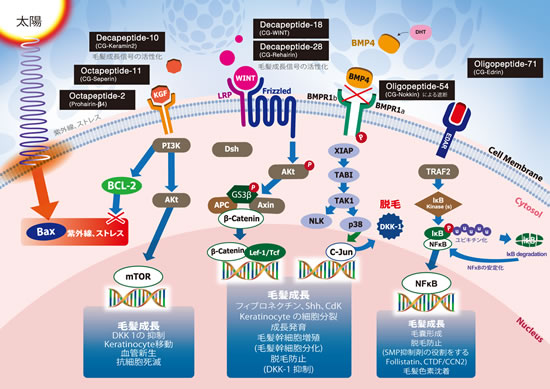 髪の再成長・頭皮の再構築のために開発された「7種類のペプチド(ペプチド複合体)」が発毛に作用し、