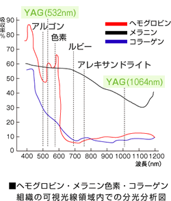 QスイッチNd:YAG(ヤグ)レーザーは、2種類の波長(532nm、1064nm)を有し、シミやアザの原因である