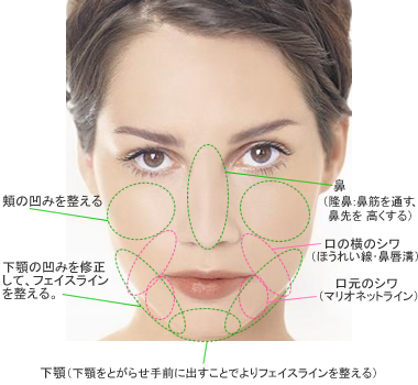 頬の凹みを整える など。