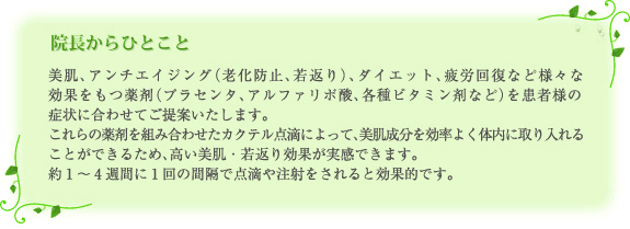 |院長からひとこと|プラセンタ|プラセンタの効果|アルファリポ酸|にんにく注射|
