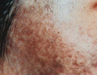 頬骨部、鼻(鼻根部正中・鼻翼部)、上顎部など、三叉神経の第1枝、第2枝領域に発生する青色〜褐色調の色素斑。