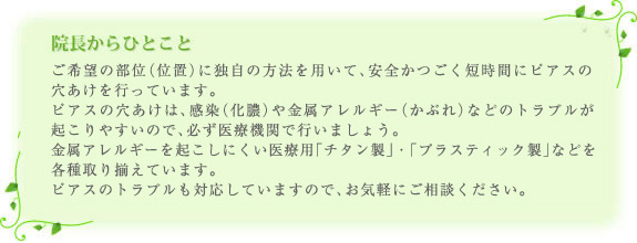 |院長からひとこと|ピアスの穴あけが可能な部位|ピアスの穴あけ方法|