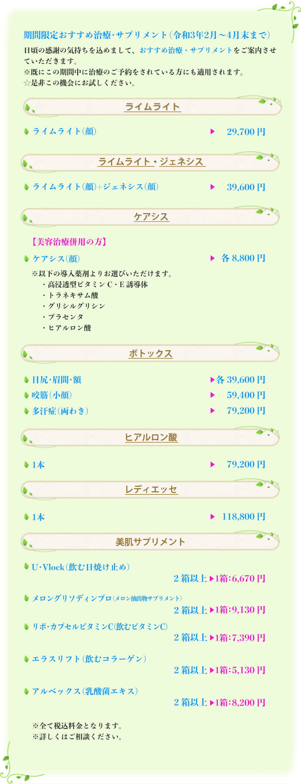 期間限定おすすめ治療・サプリメント <令和3年2月〜4月末まで>