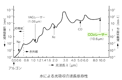 炭酸ガスレーザーは、波長が10.6μmで水に対する吸収が非常に高いため、著明な熱効果によって皮膚を切開、蒸散(※水蒸気として気化して煙となって消失していきます。)させることができます。