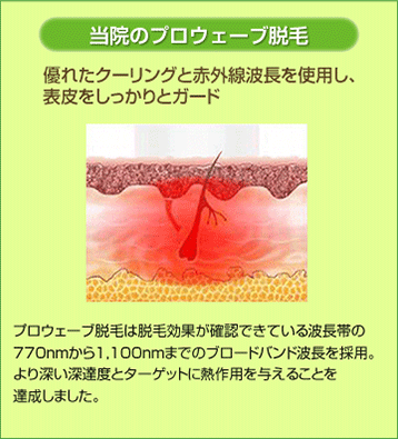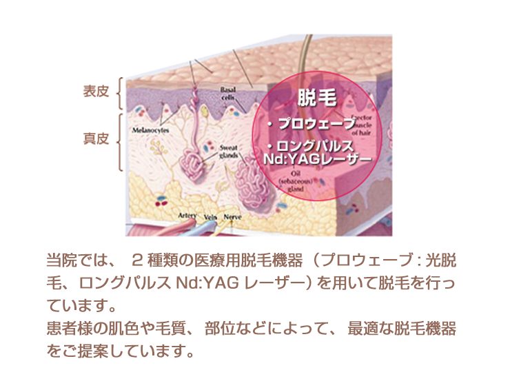 当院では、2種類の医療用脱毛機器(プロウェーブ(光脱毛)、ロングパルスヤグレーザー)を用いて脱毛を行っています。