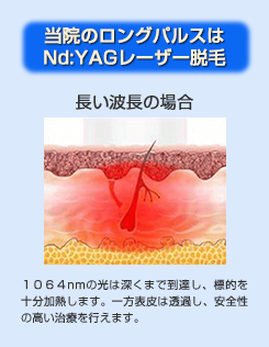 ロングパルスNd:YAGレーザーによるレーザー脱毛は、毛のメラニン色素に選択的に吸収される波長(1064nm)を使用しています。肌に優しい脱毛治療が可能な医療用脱毛治療機器です。